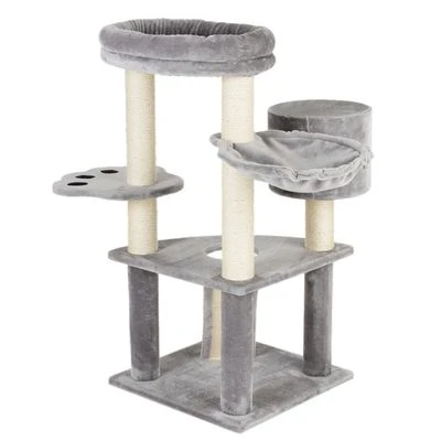 - Compact cat tree with multiple sleeping areas and scratching surfaces