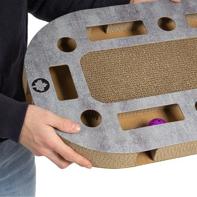 Sophisticated cat playground, with generous scratching surface, sturdy construction, integrated ball track incl. play balls, made of environmentally friendly corrugated cardboard, free of harmful substances, dimensions: L 65 x W 35 x H 5.8 cm