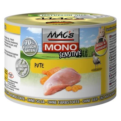 If your cat has food allergies, it is very important to choose the right food. MAC’s Cat Mono Sensitive has been specially developed for adult cats with food intolerances. This tasty wet food is made with just one meat per variety but plenty of it and it is suitable for exclusion diets. MAC’s Cat Mono Sensitive is completely free from soya and grain, which makes it particularly easy to digest.Â