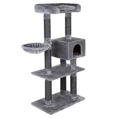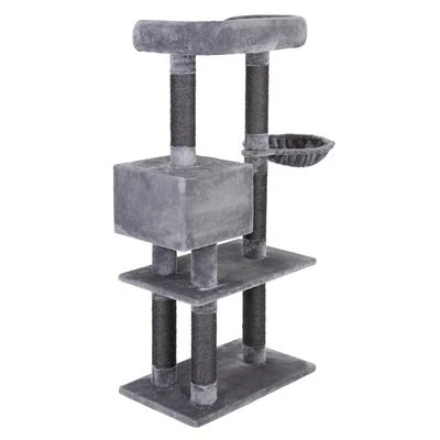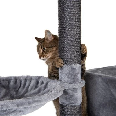 Robust scratching tree in an elegant grey, ideal for larger breed cats and with 3 padded sleeping areas and platforms, with a large cuddle bed and den, as well as a swivelling hammock.