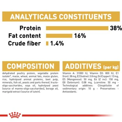 The kibble is suitable for cats over the age of 12 months, helping to support a sensitive digestive tract, which is commonly found in Siamese cats. High-quality, digestible proteins and prebiotics help support a balanced intestinal flora. Poultry protein contributes to this and provides a low fat content of just 16%, with L-carnitine to provide a solid basis for building a lean, muscular body.