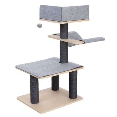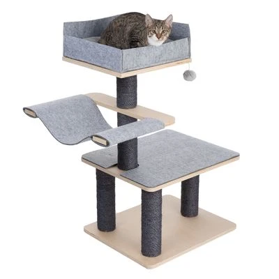 Modern cat scratching tree with contrasting colours and sisal posts to sharpen claws, with a comfortable hammock to relax on, robust felt upholstery and a stable base plate.